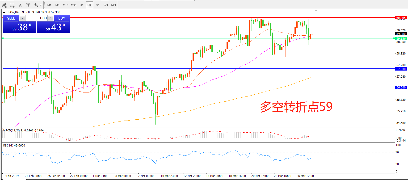 4小时图看,油价振幅逐渐收窄,冲击前高60美元后小幅回落,整体收于59美元之上,均线粘合成为短期支撑,MACD红柱缩短,RSI指标拐头向上,日内重点关注上方60美元关口能否突破.