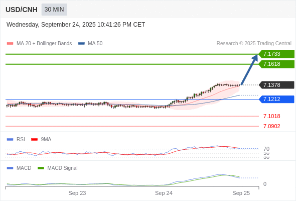 备选策略: 向下跌破 7.1212 ,将带来继续下跌的趋势,目标位为 7.1018 然后为 7.0902 。