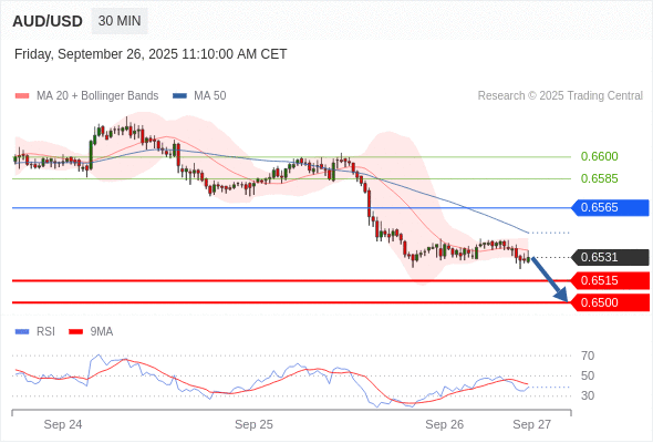 交易策略: 在 0.6565 之下,看跌,目标价位为 0.6515 ,然后为 0.6500 。
