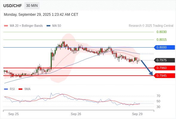 在 0.8000 之下,看跌,目标价位为 0.7960 ,然后为 0.7945 。
