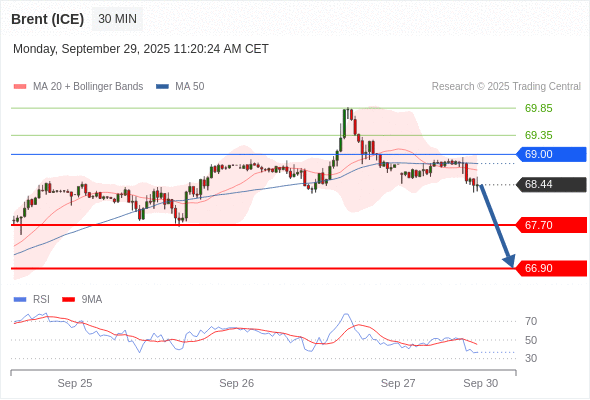 交易策略: 在 69.00 之下,看跌,目标价位为 67.70 ,然后为 66.90 。