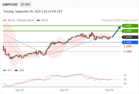 在 1.3405 之上,看涨,目标价位为 1.3460 ,然后为 1.3485 。