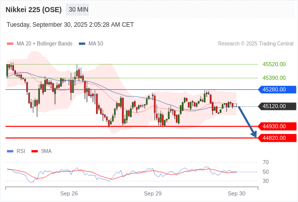 在 45280.00 之下,看跌,目标价位为 44930.00 ,然后为 44820.00 。