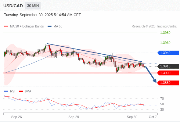 在 1.3940 之下,看跌,目标价位为 1.3900 ,然后为 1.3880 。