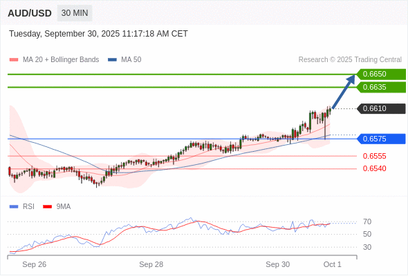 在 0.6575 之上,看涨,目标价位为 0.6635 ,然后为 0.6650 。