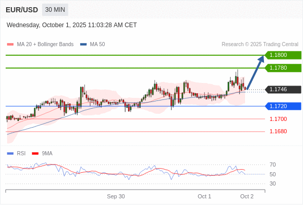 在 1.1720 之上,看涨,目标价位为 1.1780 ,然后为 1.1800 。