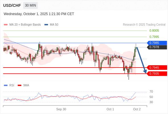 美元/瑞郎 当日内: 短期关键阻力位在0.7985。