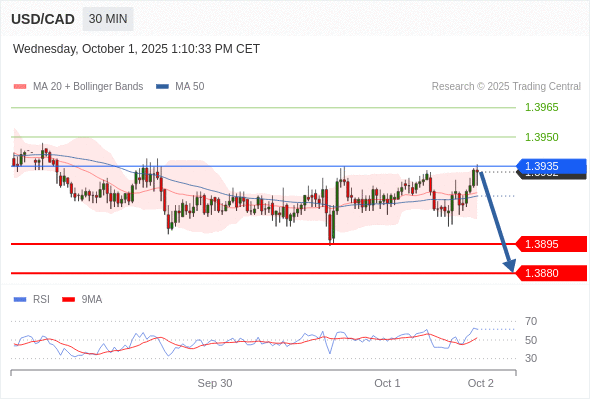 在 1.3935 之下,看跌,目标价位为 1.3895 ,然后为 1.3880 。