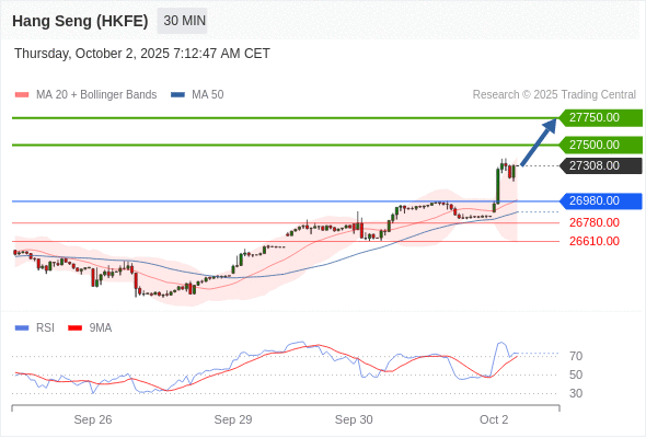 香港恒生指数期货 当日内: 目标位为27750.00。