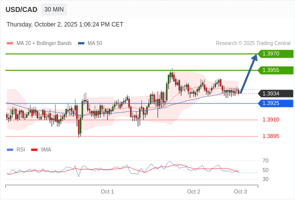 在 1.3925 之上,看涨,目标价位为 1.3955 ,然后为 1.3970 。