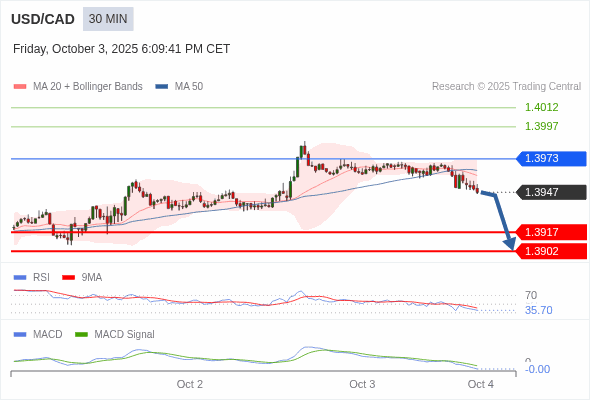 美元/加元 当日内 : 看跌,在 1.3973 之下。