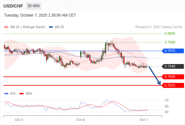 在 0.7975 之下,看跌,目标价位为 0.7930 ,然后为 0.7915 。