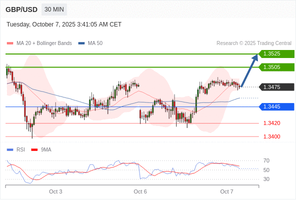 在 1.3445 之上,看涨,目标价位为 1.3505 ,然后为 1.3525 。