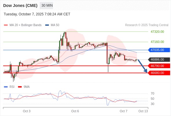 交易策略: 在 47035.00 之下,看跌,目标价位为 46790.00 ,然后为 46680.00 。