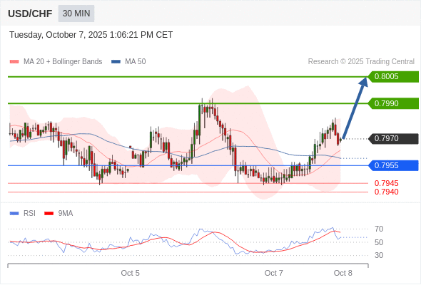 在 0.7955 之上,看涨,目标价位为 0.7990 ,然后为 0.8005 。