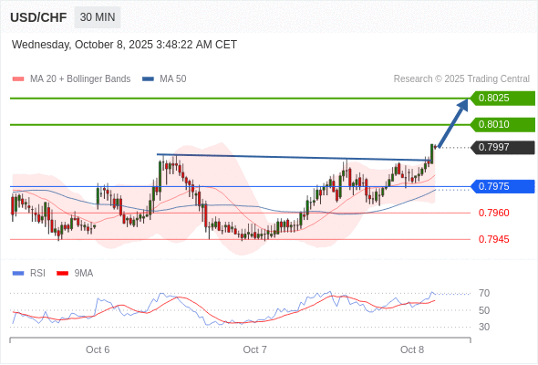 在 0.7975 之上,看涨,目标价位为 0.8010 ,然后为 0.8025 。