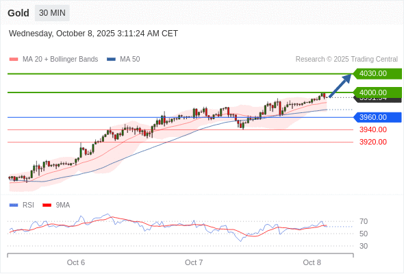 在 3960.00 之上,看涨,目标价位为 4000.00 ,然后为 4030.00 。