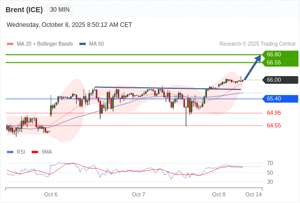 在 65.40 之上,看涨,目标价位为 66.55 ,然后为 66.80 。