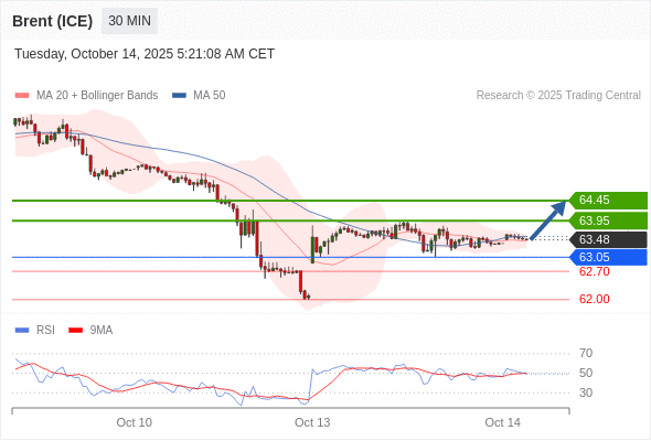在 63.05 之上,看涨,目标价位为 63.95 ,然后为 64.45 。