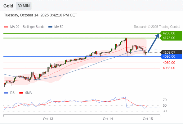 在 4090.00 之上,看涨,目标价位为 4178.00 ,然后为 4200.00 。