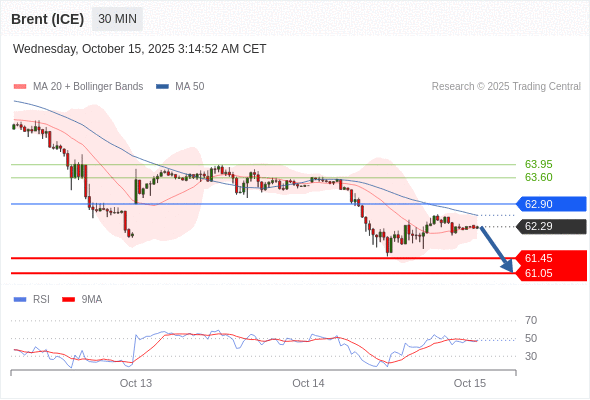 布伦特原油 (ICE) (Z5) 当日内: 短期关键阻力位在62.90。