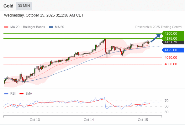 在 4125.00 之上,看涨,目标价位为 4178.00 ,然后为 4200.00 。