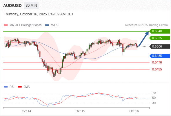 在 0.6485 之上,看涨,目标价位为 0.6525 ,然后为 0.6540 。