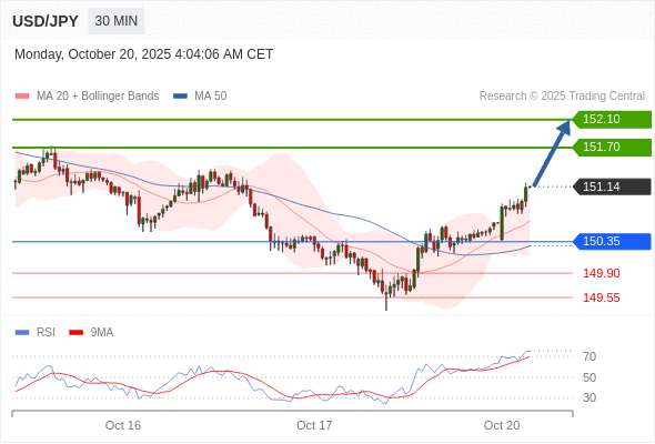 在 150.35 之上,看涨,目标价位为 151.70 ,然后为 152.10 。