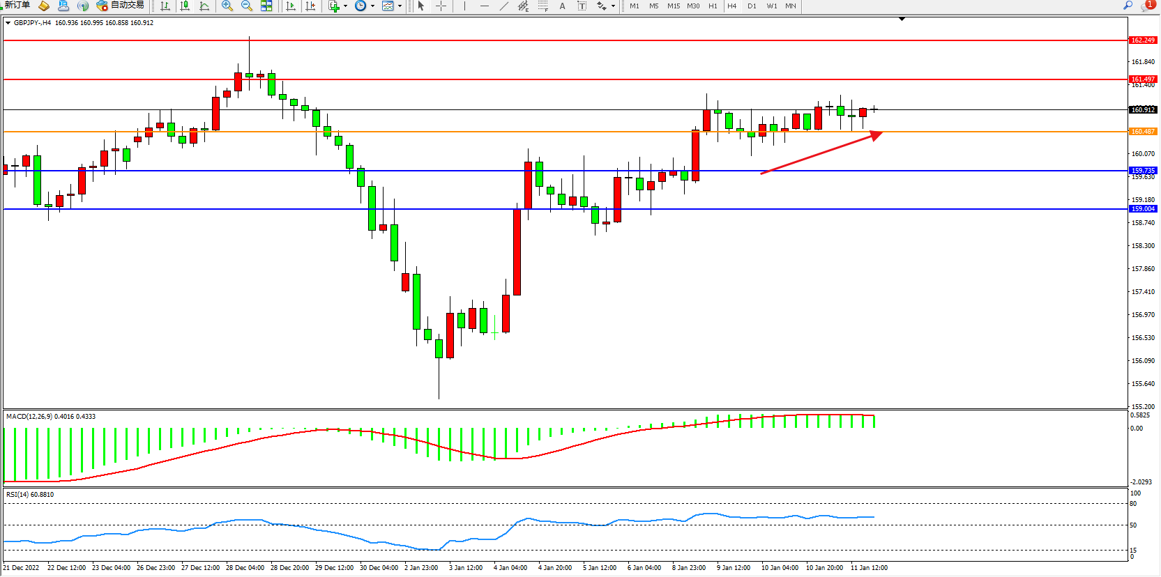 交易策略:160.487上方看涨,目标161.497、162.249