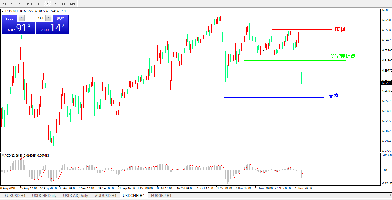 交易策略6.9089之下,看跌,目标价位为6.8505,然后为 6.8350