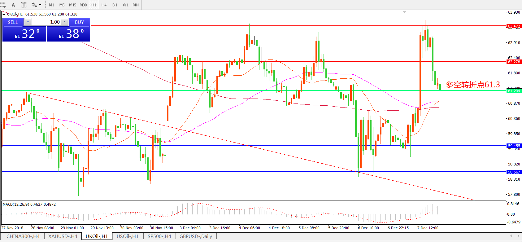 小时图看,油价冲高后连续回落,最后收于均线系统之上,也是多空转折点的61.3附近,MACD红柱缩短,短期内震荡整理概率较大。