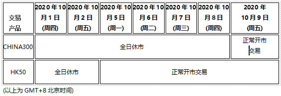 因应2020101日至108日期间为中国内地及香港市场中秋国庆双节假期,以下部分产品的交易时间将假期影响休市,敬请阁下留意知悉!