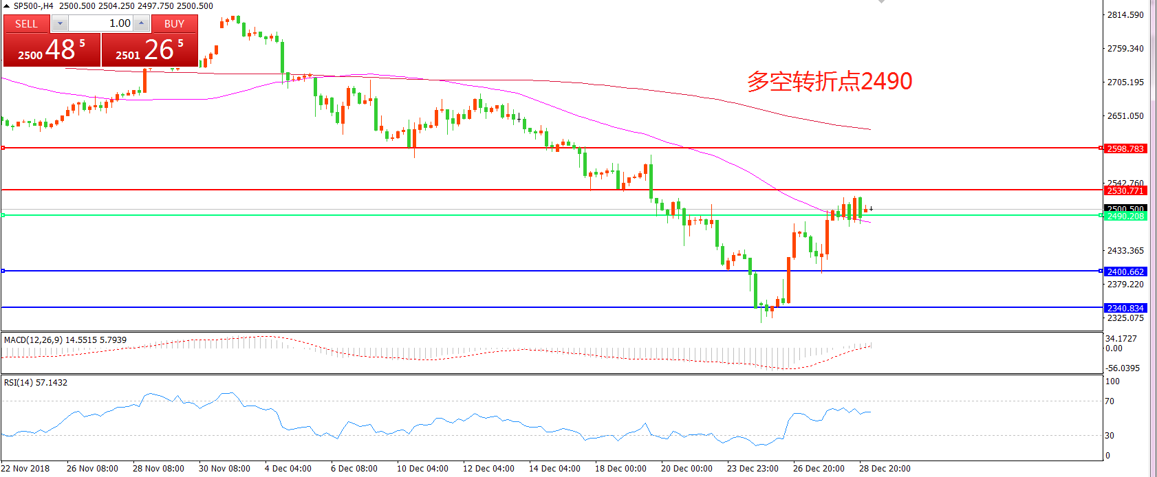 4小时图看,SP500触碰2340支撑后大幅反弹, 目前已站稳55均线之上,MACD绿柱缩短,RSI指标出现拐头,短期小幅反弹概率较大。